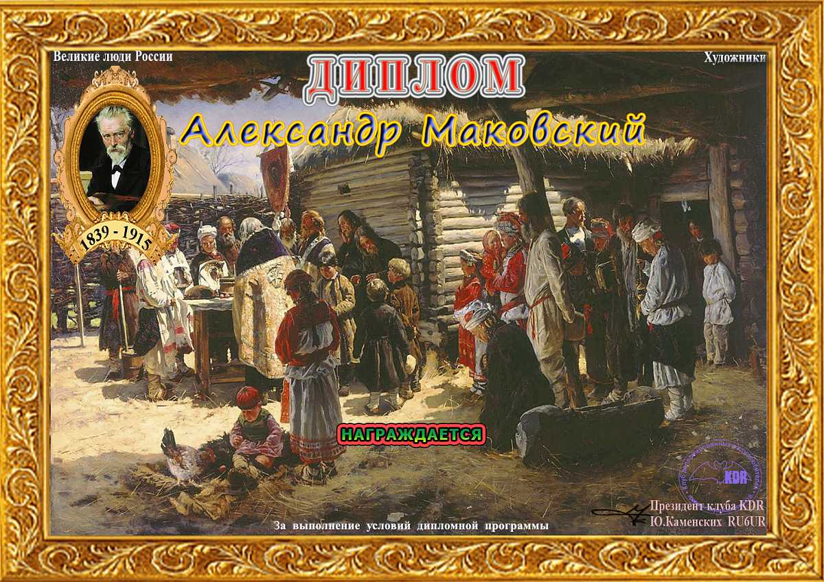 В рамках дипломной программы «Великие люди России – Историческое наследие», часть V «Художники» вашему вниманию предоставляется диплом «Александр Маковский», для получения которого необходимо набрать 1000 очков. Связи на диплом засчитываются с 25 октября 2023 года, диплом бессрочный.