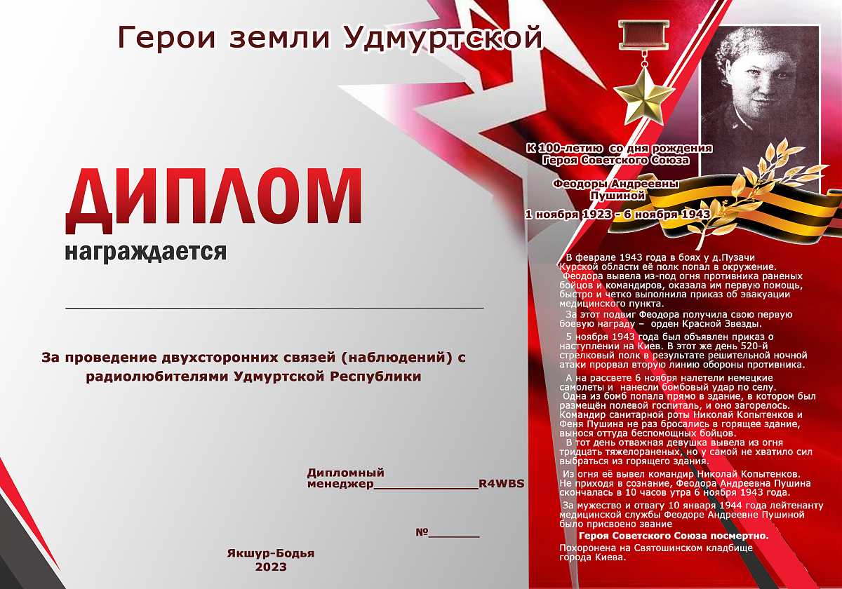 Для получения диплома необходимо предоставить заявку на диплом с выпиской из аппаратного журнала, о проведении 3-х QSO или наблюдений с радиолюбительской станцией, работающей со специальным позывным R100 FP, в период с 00.00 UTC 01 ноября 2023 года по 23.59. UTC 06 ноября 2023 года. Повторные связи засчитываются на разных диапазонах и (или) разными видами излучения (CW,SSB, DIGI).