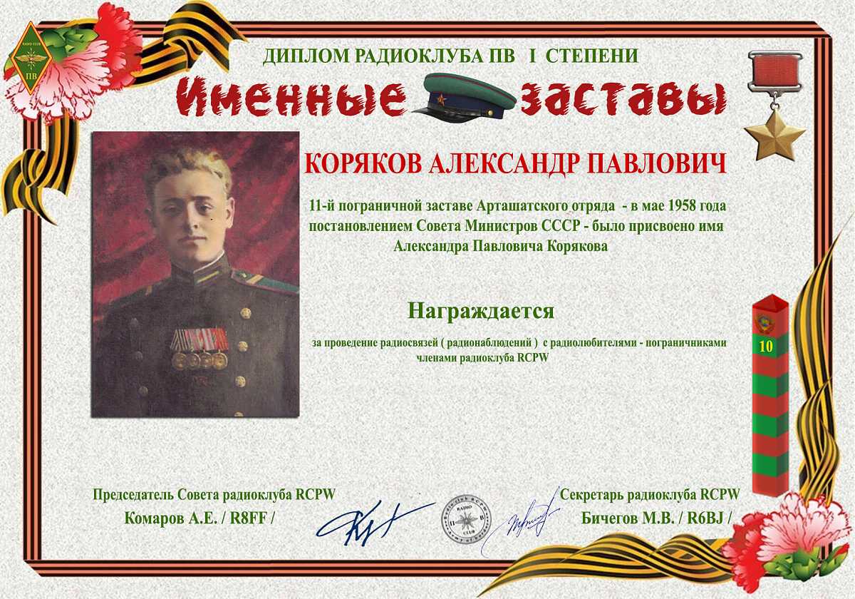 В рамках дипломной программы клуба RCPW «Именные пограничные заставы» учрежден очередной диплом – «Коряков Александр Павлович».