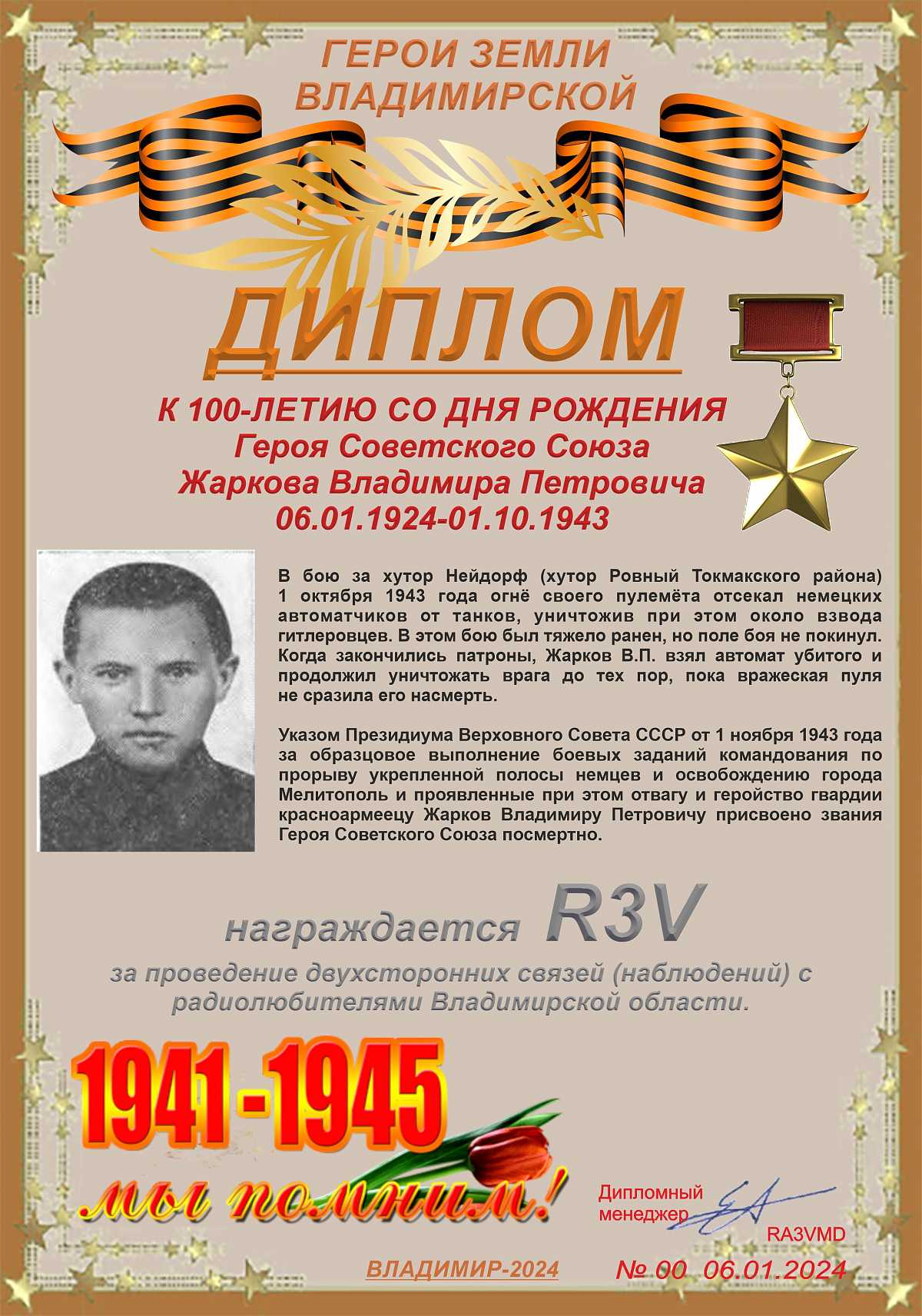 Владимирским областным радиоклубом и посвящен 100-летию со дня рождения Героя Советского Союза Жаркова Владимира Петровича – пулеметчика 2-го стрелкового батальона 262-го гвардейского стрелкового полка 87-й гвардейской стрелковой дивизии 13-го гвардейского стрелкового корпуса 2-й гвардейской армии Южного фронта, гвардии красноармейца.