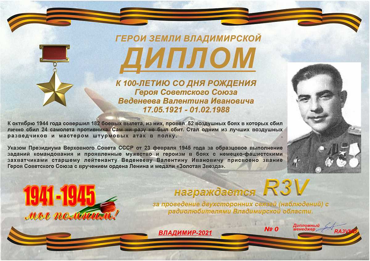 Диплом учрежден Владимирским областным радиоклубом и посвящен 100-летию со дня рождения Героя Советского Союза Веденеева Валентина Ивановича – заместителя командира, штурман эскадрильи 159-го истребительного авиационного полка (275-я истребительная авиационная дивизия, 13-я воздушная армия, Ленинградский фронт), старшего лейтенанта.