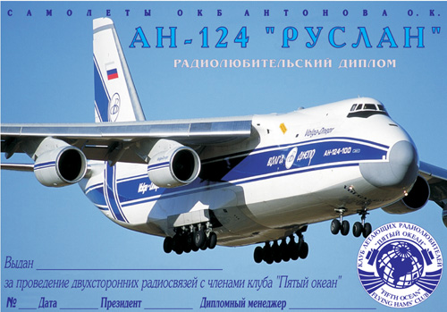 Диплом «Ан-124 «Руслан» входит в серию «Самолеты ОКБ Антонова О.К.» дипломной программы клуба «Пятый океан». Диплом выдается только при наличии у соискателя двух базовых дипломов – «Пятый океан» и «Взлет» 2-й редакции. Для получения диплома «Ан-124 «Руслан» соискателю необходимо набрать 25 очков и провести, как минимум, 2 радиосвязи с членами клуба, летавшими на самолетах ОКБ Антонова О.К. или обслуживавшими их на земле (список прилагается). За QSO с членом клуба на КВ начисляется 1 очко, на УКВ, 10 и 160м – 5 очков, с членом клуба, работающим позывным .../ам – 5 очков. Повторные QSO допускаются на разных диапазонах и другим видом излучения. Во время проведения дней и недель активности очки удваиваются. За QSO с членом клуба в минитесте клуба «Пятый океан» начисляется 5 очков. Засчитываются связи, проведённые после 04 апреля 1992 года. Дипломы выдаются на основании заявки в виде выписки из аппаратного журнала или отчета об участии в минитесте клуба «Пятый океан». В заявке на «Ан-124 «Руслан» следует указать номера имеющихся у соискателя дипломов "Пятый океан" и "Взлет" 2-й редакции. Допускается одновременное получение «Ан-124 «Руслан» и базовых дипломов. Стоимость диплома – 50 рублей для соискателей из России и ближнего зарубежья и 3 доллара США - для соискателей из дальнего зарубежья. В стоимость диплома включены затраты на пересылку.