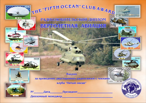 Для получения диплома «Вертолетная авиация» соискателям необходимо набрать 25 очков и провести, как минимум, 1 радиосвязь с членом клуба, летавшим на вертолетах или обслуживавшим их на земле (список прилагается).