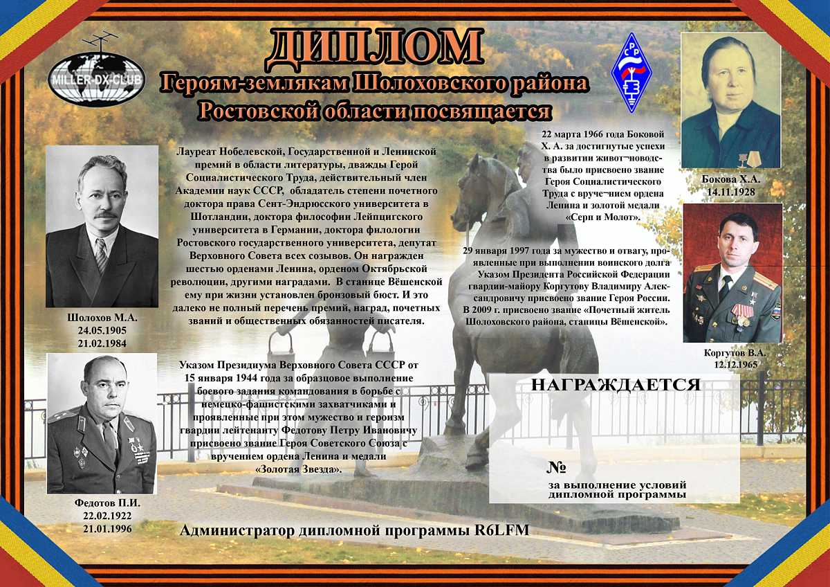 В ознаменовании образования Шолоховского района Ростовской области и в честь рождения героев: Героя Советского Союза Федотова Петра Ивановича, Героя России Коргутова Владимира Александровича, дважды Героя Социалистического Труда Шолохова Михаила Александровича, Героя Социалистического Труда Боковой Хритинии Алексеевны, муниципальным бюджетным учреждением дополнительного образования «Центр творчества Шолоховского района» учрежден этот диплом.