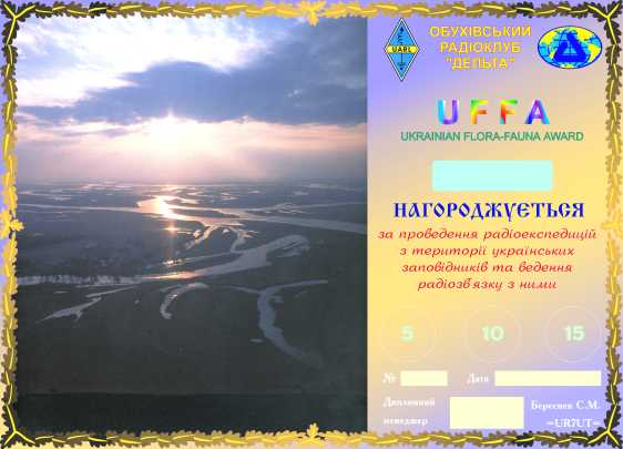 Диплом UFFA выдается Обуховским радиоклубом "Дельта", Киевской области за проведение радиоэкспедиций на территории украинских заповедников и национальных парков или за проведение радиосвязей с ними.