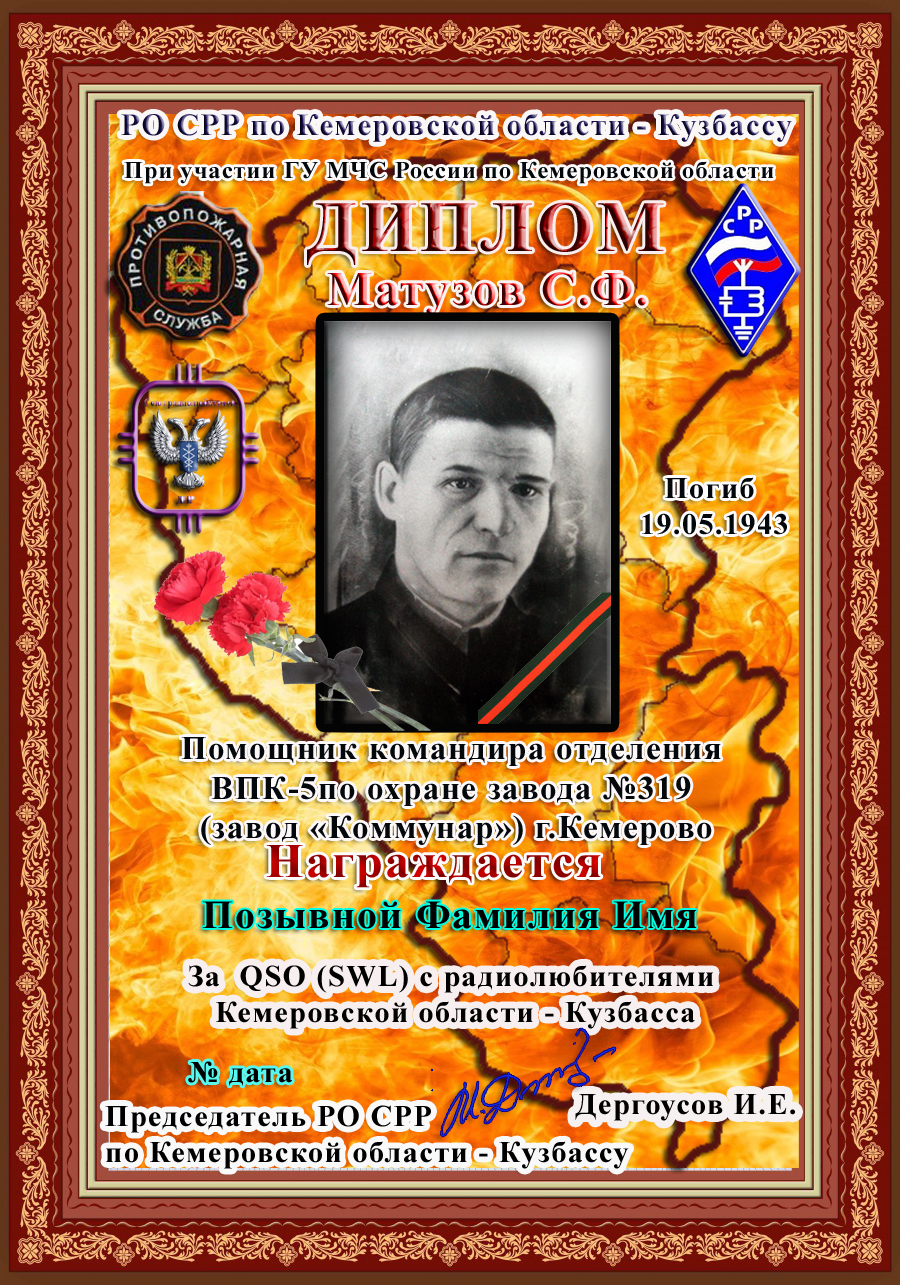 Диплом «Матузов С.Ф.» учреждён региональным отделением Союза радиолюбителей России по Кемеровской области – Кузбасса при участии ГУ МЧС России по Кемеровской области – Кузбассу и Союза радиолюбителей ДНР. Входит в дипломную программу «Огнеборцы Кузбасса», серия «Книга памяти».