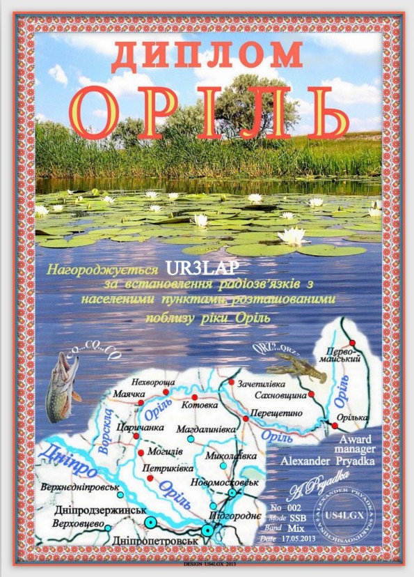 Диплом «ОРІЛЬ» учрежден радиолюбителем Александром Прядка US4LGX и выдается за проведение радиоэкспедиций с берега реки Орель или проведение радиосвязей с населенными пунктами возле данной реки. Для получения диплома необходимо провести одну радиоэкспедицию с берега реки Орель или установить радиосвязи с пятью населенными пунктами расположенными на расстоянии не более 20 километров от реки. Связь с радиоэкспедицией приравнивается к 2 QSO с населенными пунктами. Экспедиция засчитывается, если проведено не менее 50 QSO, радиостанция расположена не далее 50 метров от берега реки и работает от автономного источника питания (бензоагрегат, аккумулятор и т.п.). Повторные связи с экспедицией засчитываются на разных любительских диапазонах и разными видами модуляции.