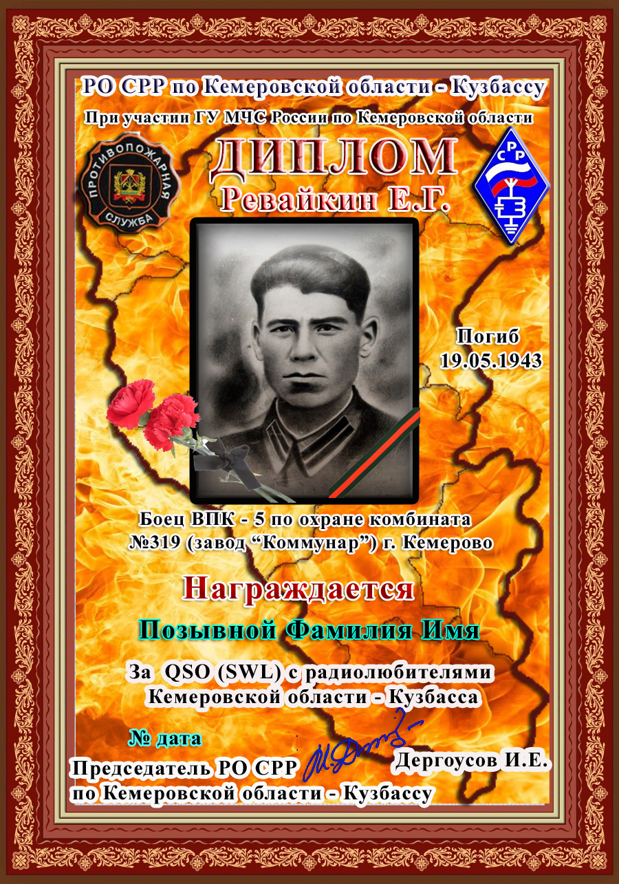 Диплом «Огнеборец Ревайкин Е.Г.» учреждён региональным отделением Союза радиолюбителей России по Кемеровской области – Кузбасса при участии ГУ МЧС России по Кемеровской области - Кузбассу. Входит в дипломную программу «Огнеборцы Кузбасса», серия «Книга памяти».