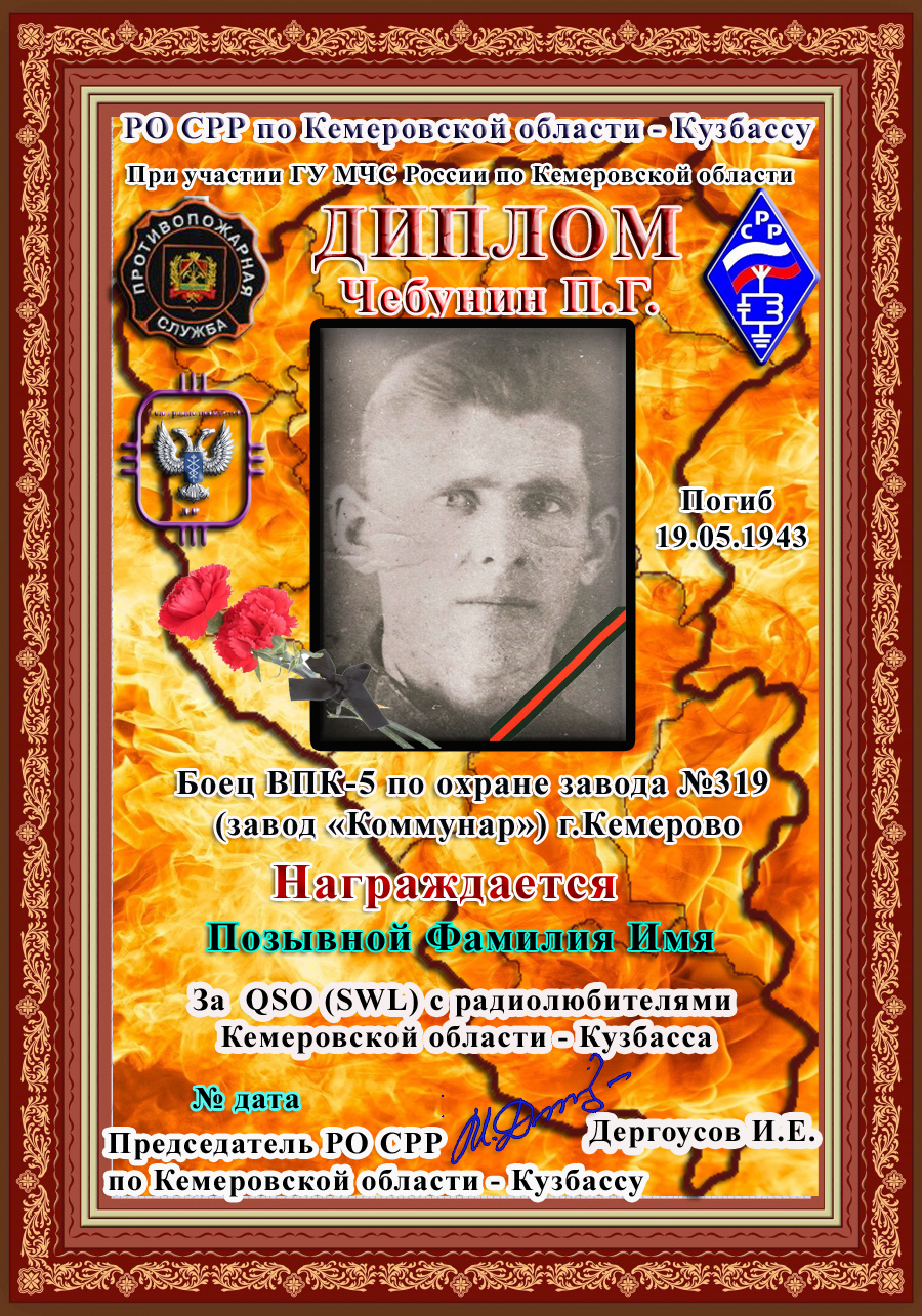 Диплом «Огнеборец Чебунин П.Г.» учреждён региональным отделением Союза радиолюбителей России по Кемеровской области – Кузбасса при участии ГУ МЧС России по Кемеровской области – Кузбассу и Союза радиолюбителей ДНР. Входит в дипломную программу «Огнеборцы Кузбасса», серия «Книга памяти».