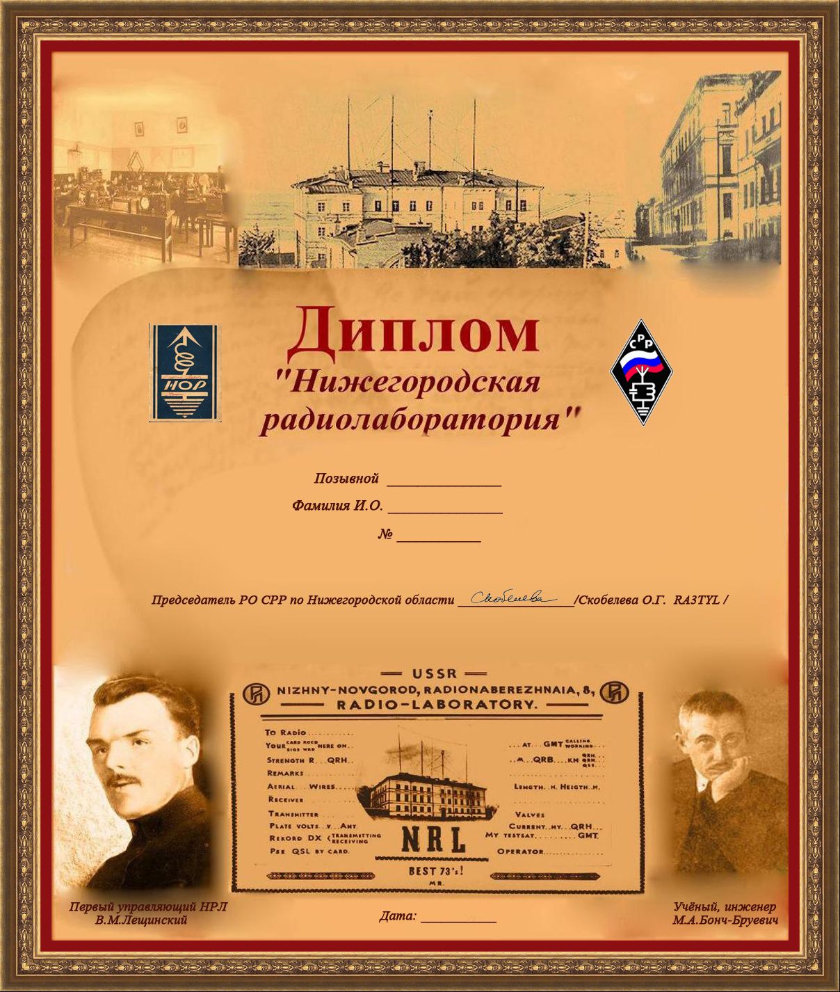Диплом посвящен образованию в Нижнем Новгороде легендарной «Нижегородской Радиолаборатории» - «НРЛ» - 2 декабря 1918 года.