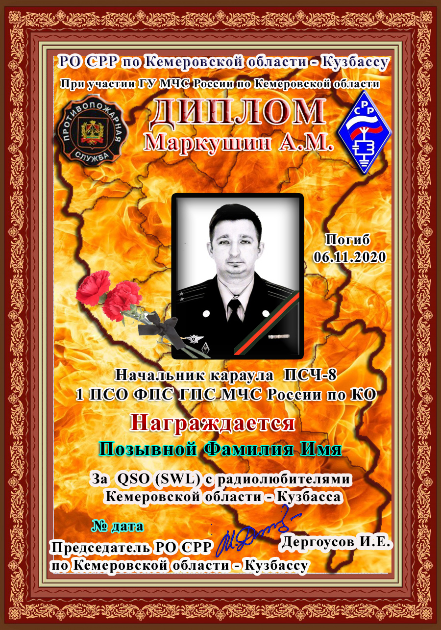 Диплом «Огнеборец Маркушин А.М.» учреждён региональным отделением Союза радиолюбителей России по Кемеровской области – Кузбасса при участии ГУ МЧС России по Кемеровской области – Кузбассу. Входит в дипломную программу «Огнеборцы Кузбасса», серия «Книга памяти».