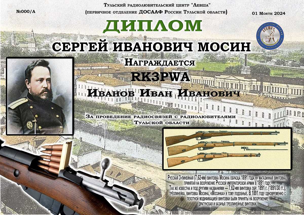 В ознаменование 175-летия со дня рождения выдающегося русского оружейного конструктора Сергея Ивановича Мосина, Тульский радиолюбительский центр "Левша" (первичное отделение ДОСААФ России Тульской области) учреждает диплом "Сергей Иванович Мосин".