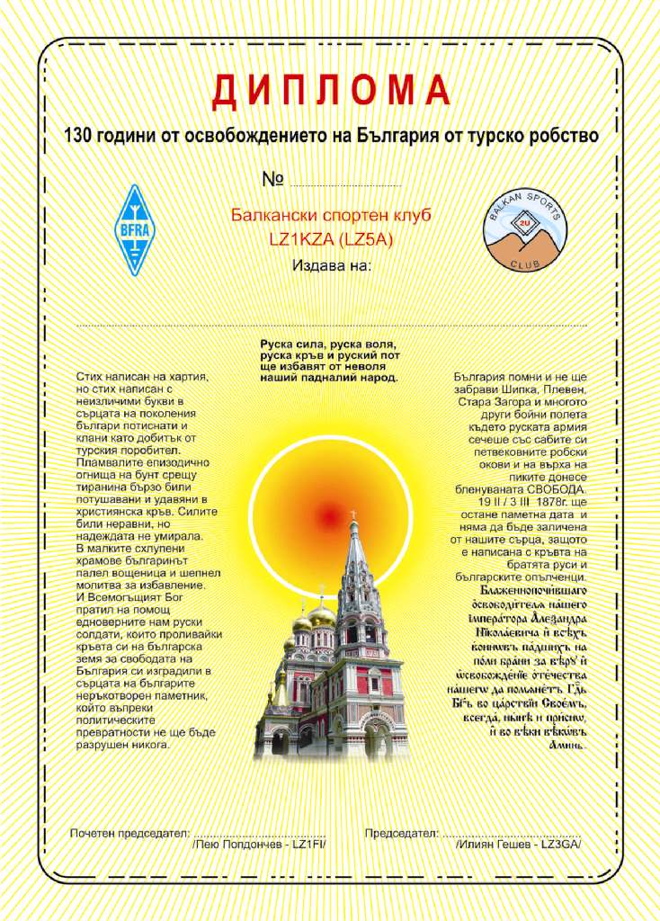 В связи со 130-й годовщиной Освобождения Болгарии Россией от турецкого рабства, Балканский Контест-Клуб LZ1KZA с 1-го января 2008 года до 31-го марта 2008 г. будет работать в эфире, изпользуя специальный позывной LZ130LO (Лет Освобождения). QSL via LZ1KZA.