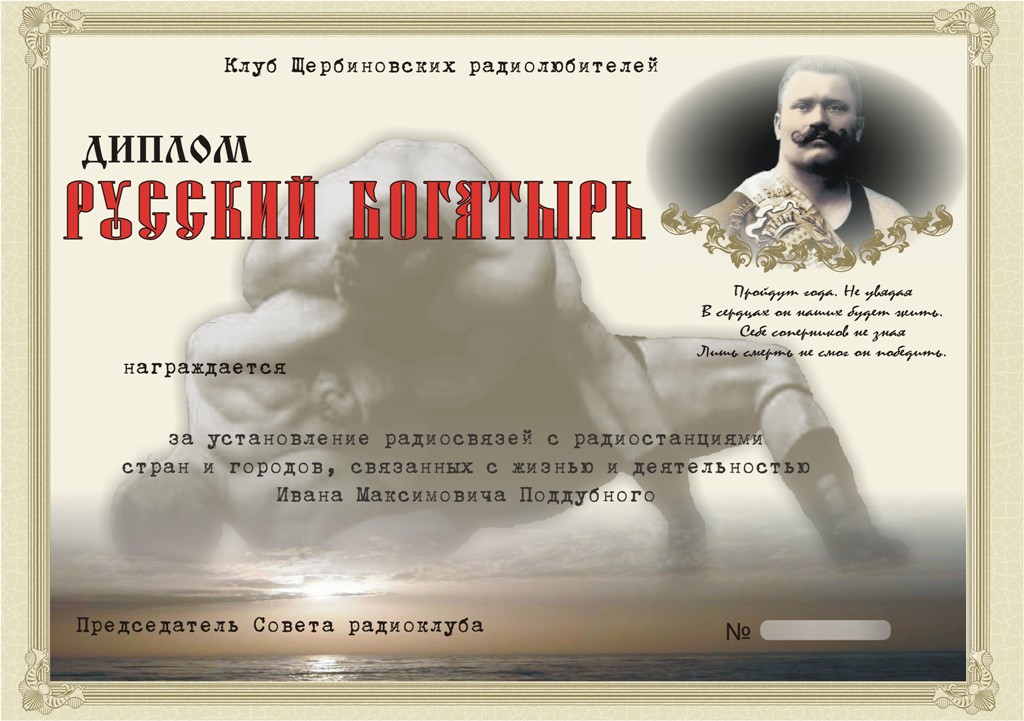 Диплом учрежден клубом Щербиновских радиолюбителей в честь великого русского борца и атлета Ивана Максимовича Поддубного.