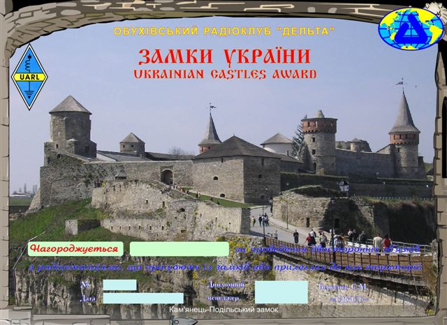 Диплом "Замки Украины" учрежден Обуховским РК "Дельта", Киевский области и выдается за проведение двухсторонних радиосвязей с радиостанциями, работающими из замков или прилегающих к ним территорий в радиусе не более одного километра, расположенных на территории Украины.