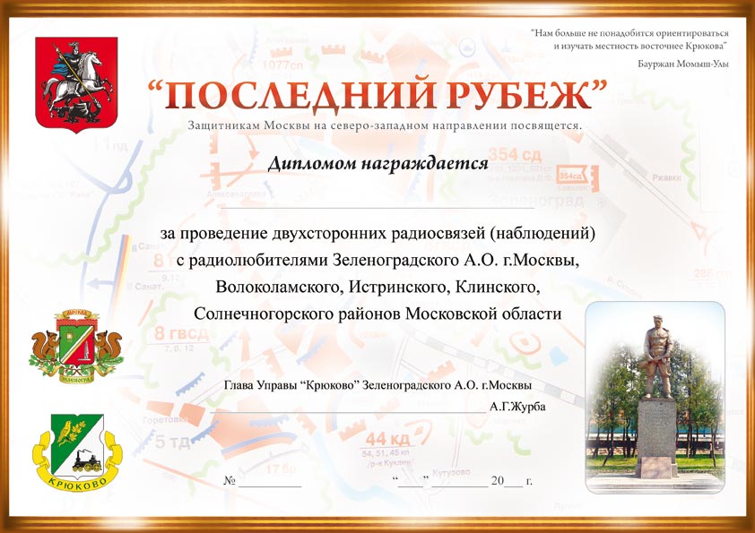 Радиолюбительский диплом "Последний рубеж учрежен Управой муниципального района Крюково Зеленоградского административного округа г. Москвы в ознаменование семидесятилетия начала контрнаступления советских войск около деревни Крюково и поселка Крюково в декабре 1941 года.