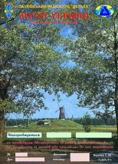 Диплом "Музеи Украины" учрежден Обуховским РК "Дельта" Киевской области и выдается за проведение двухсторонних связей с радиостанциями, работающими из музеев Украины или с прилегающих к ним территорий в радиусе не более одного километра.