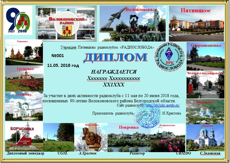 Соискателям диплома необходимо набрать 90 очков. Все станции Волоконовского района дают по 20 очков, коллективная станция RK3Z - 30 очков, повторы зачитываются на разных диапазонах. Планируется работа на 160-80-40-20-15 метрах. QSO с коллективной радиостанцией обязательно.