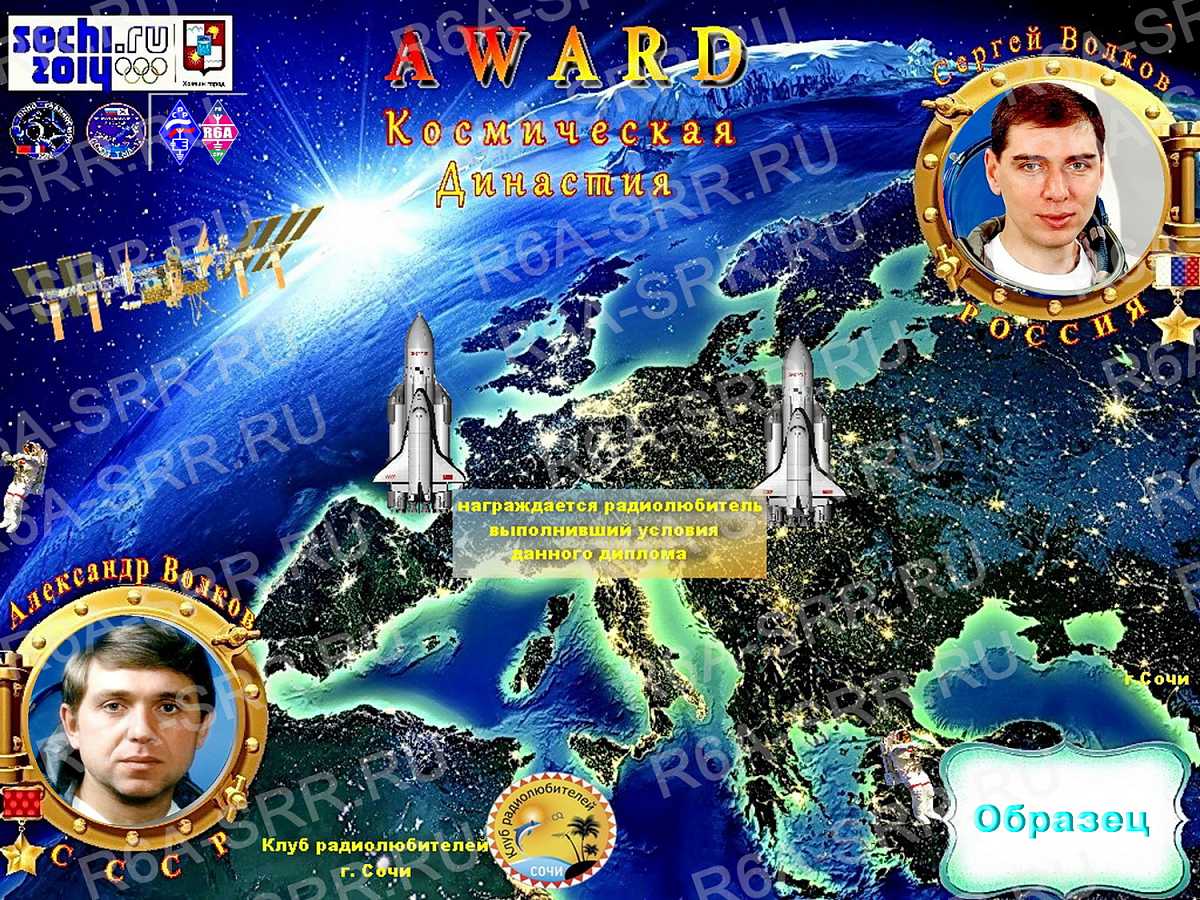 В честь этих знаменательных событий Клуб радиолюбителей г.Сочи учредил диплом «Космическая династия». Александр Александрович Волков (U4MIR), ознакомился с условиями и самим дипломом и одобрил его, будучи в гостях на молодёжной коллективной радиостанции RO7C г.Сочи 11 апреля 2018г. Диплом запускается в работу с 00.00мск 25 мая 2018 года с и действует до 00.00мск 31 декабря 2018 года.