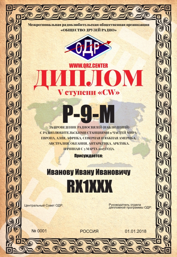 1.Базовый диплом ОДР Р-9-М "Части света (мира)" (За работу с девятью частями света (мира)). Выдается радиолюбителям всех стран за проведение радиосвязей (наблюдений) на любых радиолюбительских диапазонах с радиолюбительскими станциями, расположенными в девяти частях света (мира), начиная с 3 марта 1924 года.