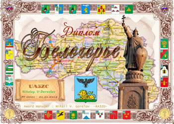Диплом БЕЛОГОРЬЕ выдается радиолюбителям и наблюдателям России, стран СНГ и других стран за проведение радиосвязей (наблюдений ) с радиолюбителями Белгородской области.