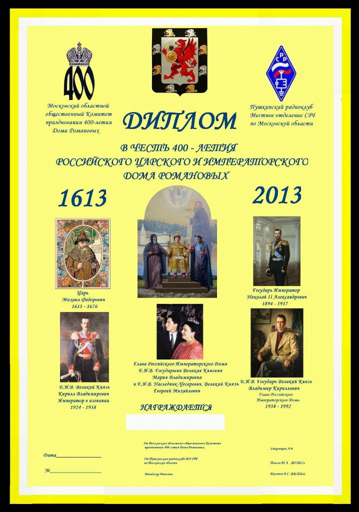 Юбилейный Диплом «В честь 400-летия Российского Царского и Императорского Дома Романовых» (1613-2013) учрежден Пушкинским радиоклубом Местного отделения СРР по Московской области" и "Общественным Комитетом Московской области по празднованию 400-летия Дома Романовых". Дизайн диплома прошел одобрение в Канцелярии Главы Российского Императорского Дома Е.И.В. Государыни Великой Княгини Марии Владимировны Романовой.