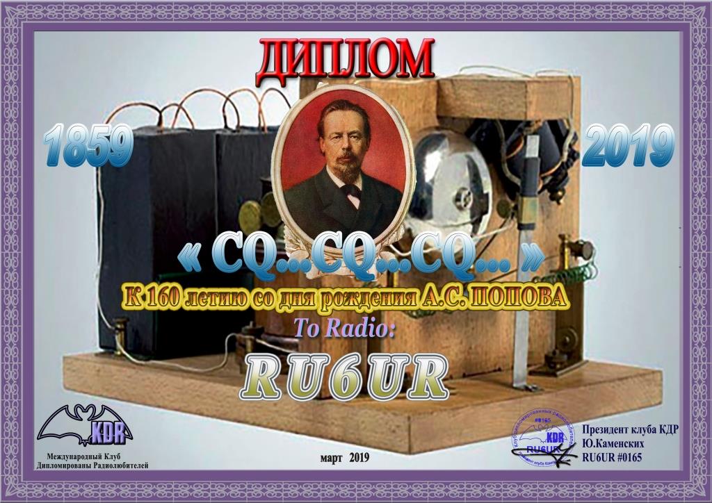 Клуб Дипломированных Радиолюбителей, в часть 160 летия со дня рождения великого русского физика и изобретателя А.С. Попова, учредил диплом "CQ...CQ...CQ..."