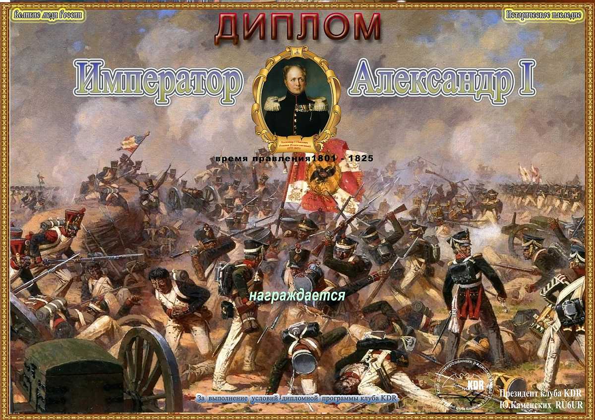 В рамках дипломной программы клуба дипломированных радиолюбителей «Великие люди России - Историческое наследие» (первая часть программы «От Рюрика до Николая II») вашему вниманию предоставляется диплом «Император Александр I», для получения которого необходимо набрать 1000 очков. Связи на диплом засчитываются с 28 апреля 2021 года, диплом бессрочный.