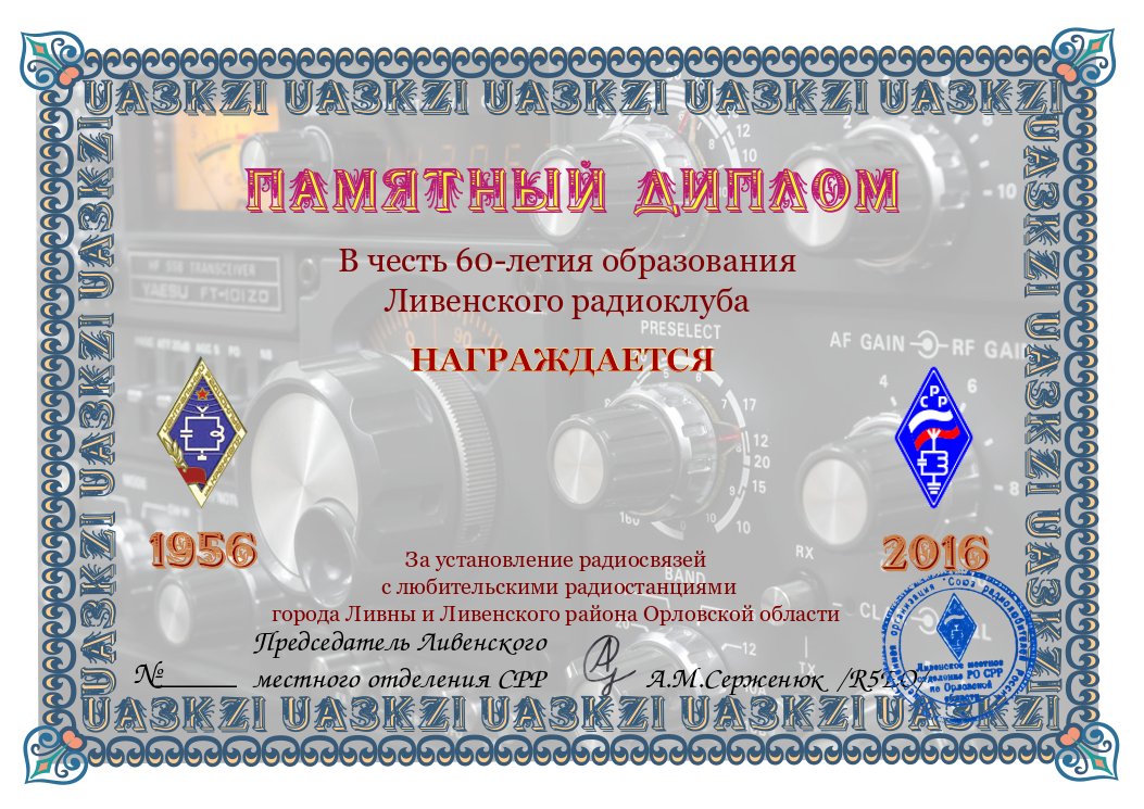 Диплом “Ливенскому радиоклубу 60 лет” учрежден Ливенским Местным Отделением РО СРР Орловской области с целью празднования этого события, популяризации радиолюбительства, укрепления дружеских и спортивных связей с радиолюбителями России и всего мира.