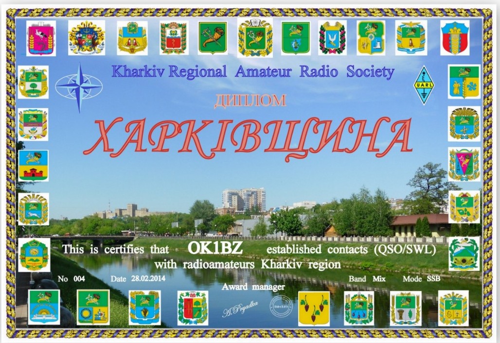 Диплом «ХАРКІВЩИНА» выдается за проведение радиосвязей на КВ с радиолюбителями Харьковской области и г.Харьков. В зачёт идут связи, проведённые с 1 января 2014 года. Для получения диплома на КВ необходимо провести QSO/SWL: