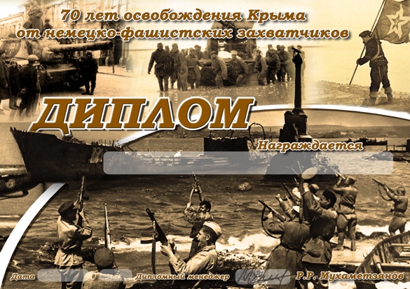 Специальный диплом “70 лет освобождения Крыма” выдается за связи (наблюдения) с 11 апреля по 11 августа 2014 года. Диплом бесплатный и будет разослан в электронном виде. Повторные радиосвязи (наблюдения) засчитываются на разных диапазонах и разными видами излучения. Для выполнения диплома необходимо набрать 70 очков. За QSO (SWL) со станциями R70KRC, R70SEV, RK70RK, RP69FE, RP69KC, RP69KP, RP69KR, RP69SE начисляется 7 очков. За QSO (SWL) с другими станциями Республики Крым начисляется 3 очка. Для соискателей не из Европы очки удваиваются. Заявки принимаются по e-mail: RK70RK@mail.ru Периоды активности: RK70RK (Республика Крым) 11-26 апреля R70KRC (город-герой Керчь) 11-26 апреля R70SEV (город-герой Севастополь) 9 мая - 8 августа RP69FE (Феодосия), RP69KC (Керчь), RP69KP (Красноперекопск), RP69KR (Крым), RP69SE (Севастополь) 3-9 мая