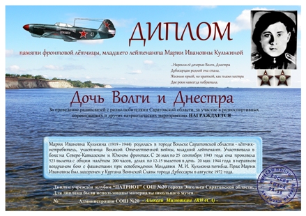 Диплом учрежден клубом «ПАТРИОТ» СОШ №20 города Энгельса Саратовской области