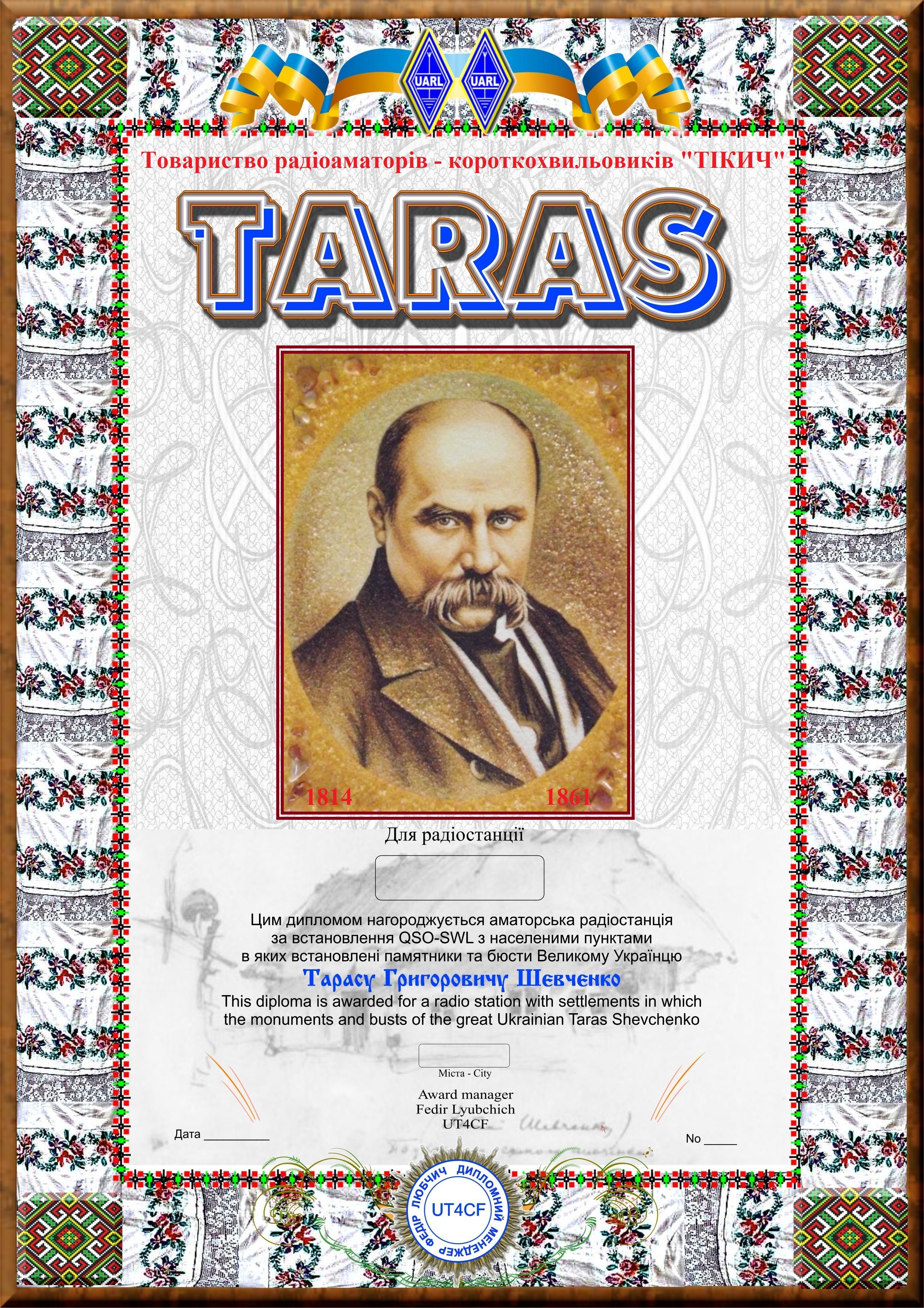Нужно провести на диапазонах 3,5...28 mHz 30 QSO, 1,8 mHz - 15 QSO, цифровыми видами связи и на УКВ - 5 QSO с населенными пунктами Украины, в которых установлены памятники или бюсты Т.Г.Шевченко.