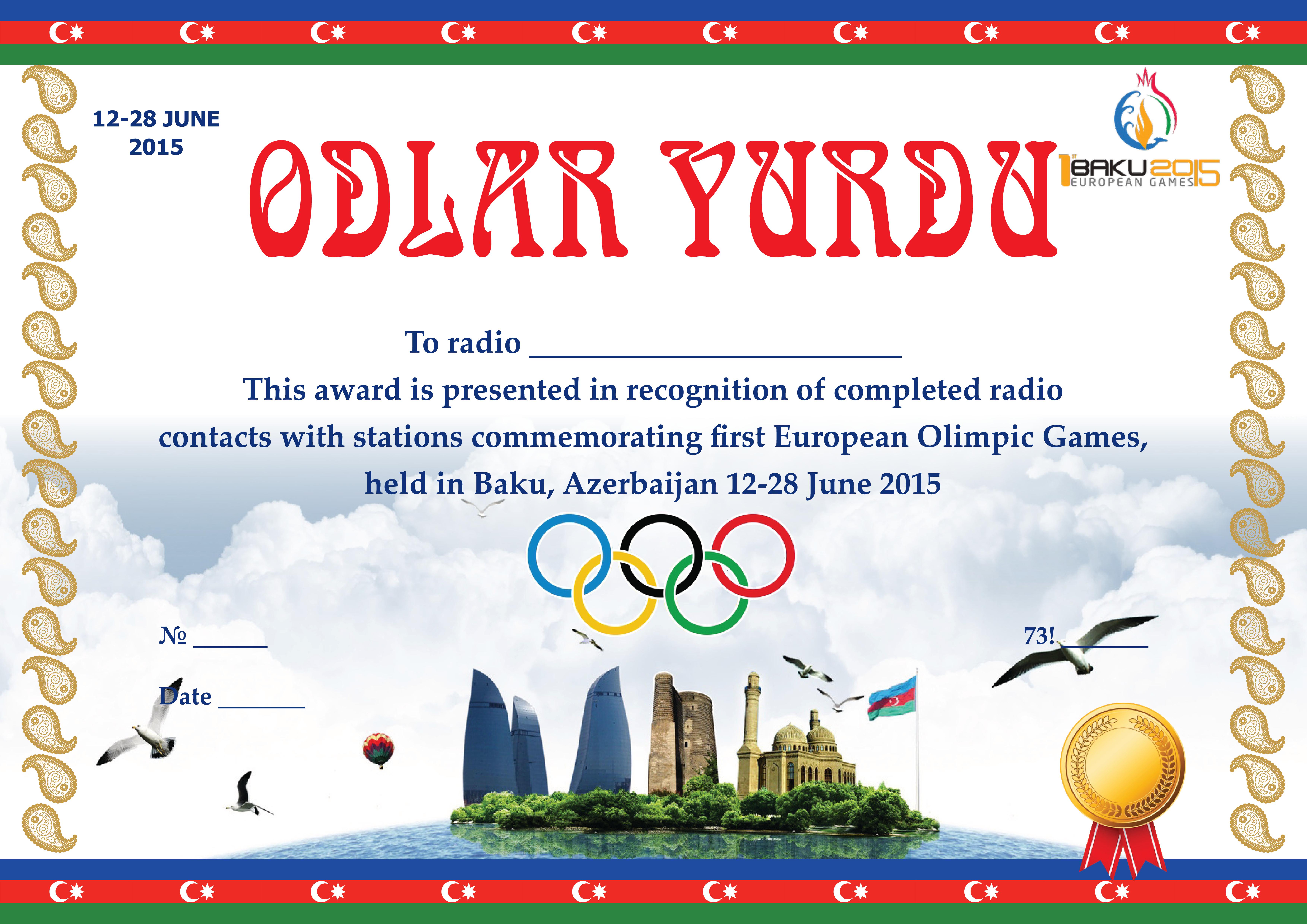 Диплом «Odlar Yurdu» присуждается за проведение QSO/SWL c любительскими радиостанциями Азербайджана - места проведения первых Европейских игр "Баку-2015".