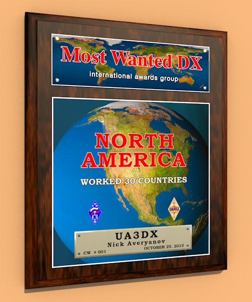 Плакетка выдается за QSO/SWL с 30 странами Северной Америки на любом диапазоне,включая WARC.