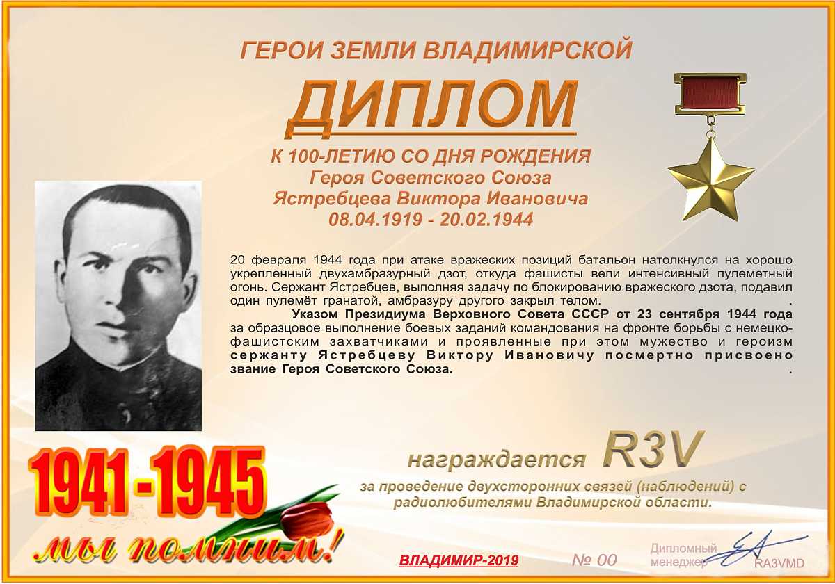 Диплом учрежден Владимирским областным радиоклубом и посвящен Герою Советского Союза Виктору Ивановичу Ястребцеву — помощнику командира взвода 1178-го стрелкового полка 350-й стрелковой Житомирской ордена Богдана Хмельницкого дивизии 13-й армии 1-го Украинского фронта, Герою Советского Союза, сержанту.