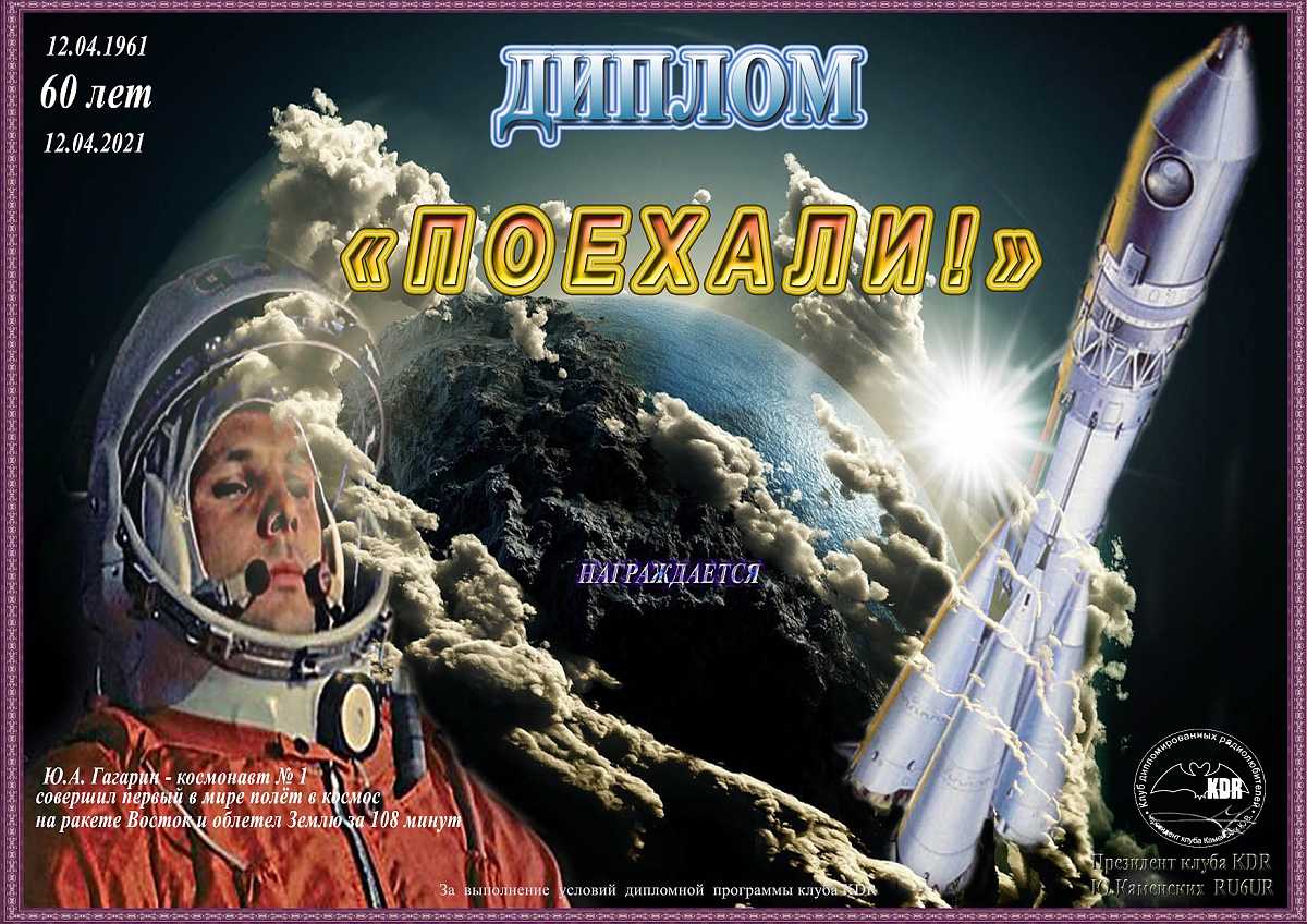 Диплом учреждён Советом Клуба Дипломированных Радиолюбителей (КДР) в честь первого полёта человека в космос. Для получения диплома необходимо в период 00:00 UTC 10 апреля до 23:59 UTC 12 апреля текущего года набрать 60 очков в 2021 году (61 очко в 2022 и т.д.)