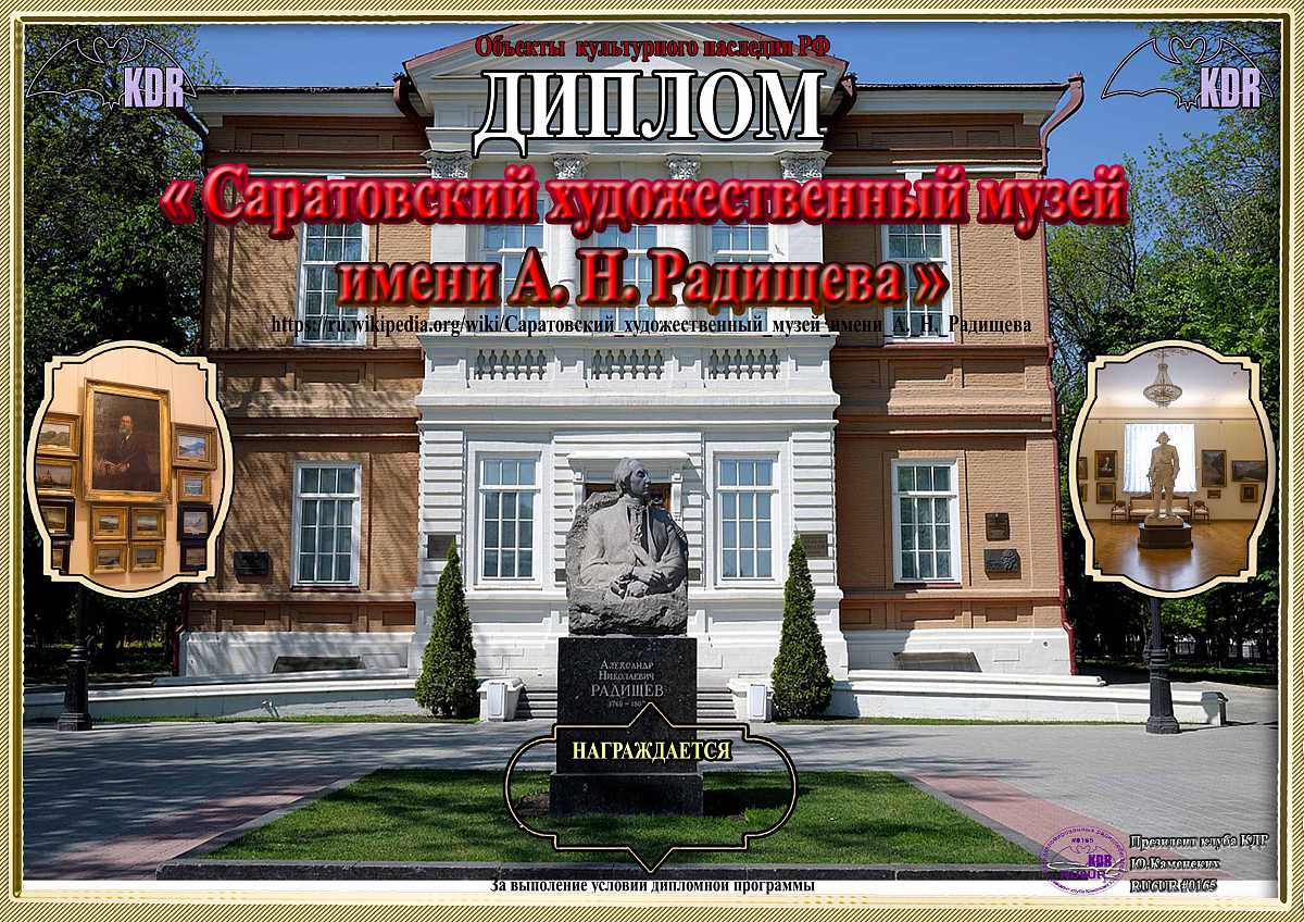В рамках дипломной программы «Объекты культурного наследия России федерального значения» вашему вниманию предоставляется диплом «Саратовский художественный музей имени А.Н.Радищева», для выполнения условий необходимо набрать 100 очков. Связи на диплом засчитываются с 21 августа 2024 года, диплом бессрочный. Очки начисляются:
