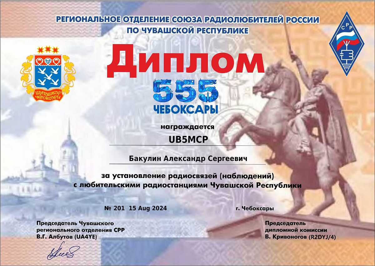 Диплом выдается за установление (наблюдение) 10 радиосвязей с любительскими радиостанциями Чувашии, за 1 радиосвязь c юбилейной радиостанцией R555Y или с коллективными радиостанциями RZ4Z, RN4Z и R4YAY. Виды модуляции и диапазоны – любые. На УКВ диапазонах достаточно провести 1 радиосвязь (наблюдение). Повторные связи не засчитываются.