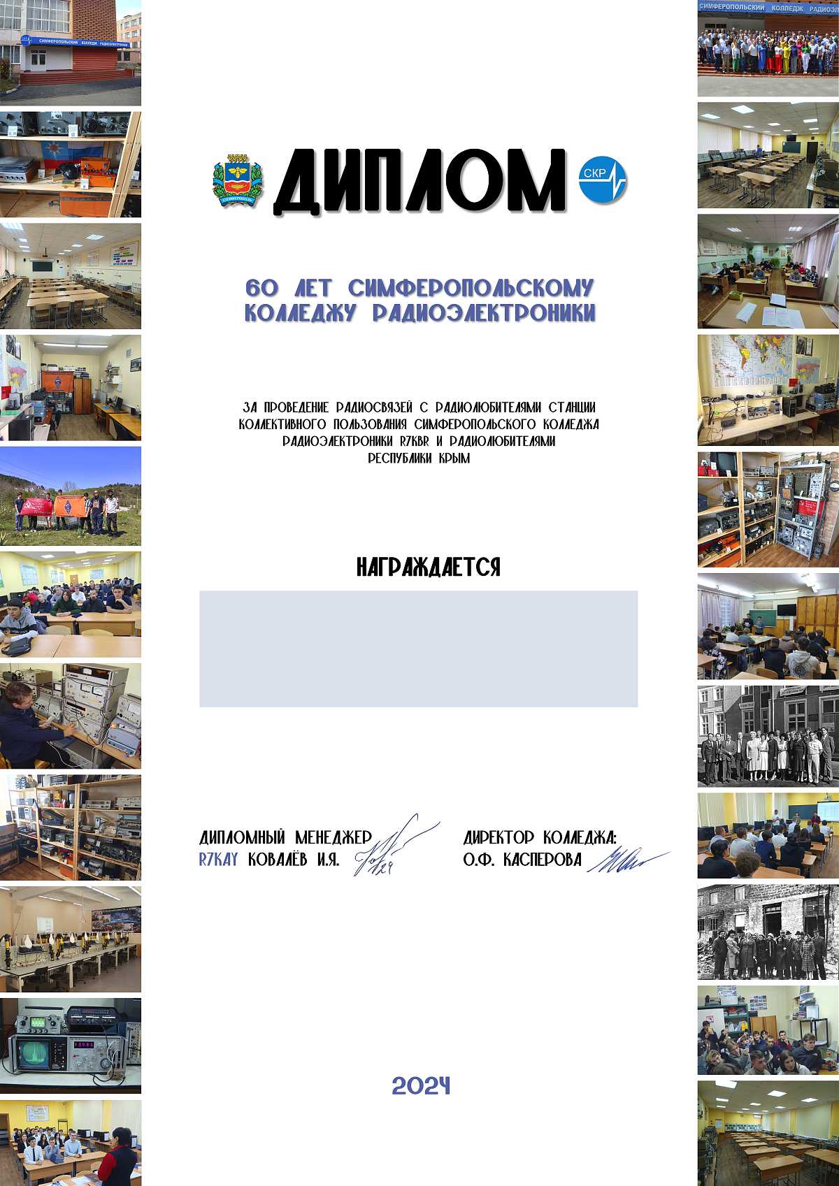 Диплом одной степени выдается в электронном виде на ресурсе Ham-log за проведение QSO с радиолюбителями Республики Крым в период с 27 сентября по 31 октября 2024.