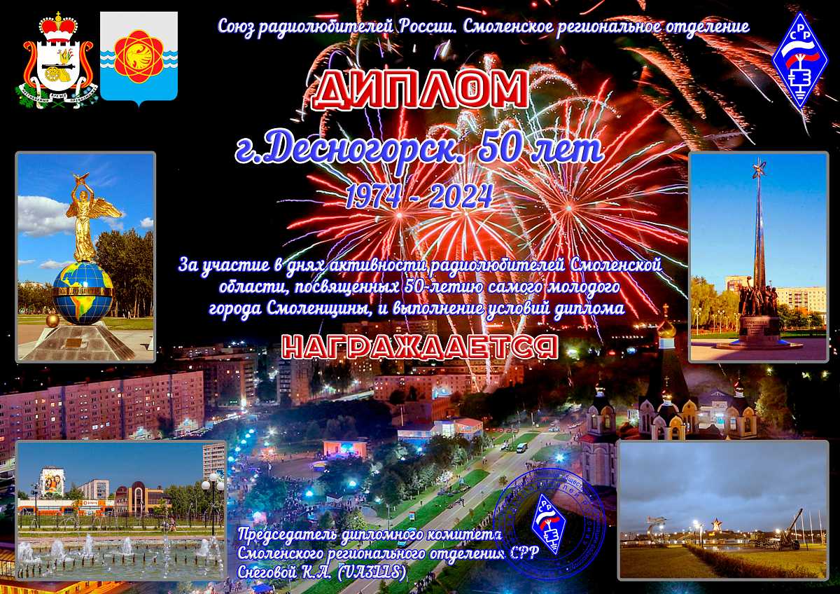 Диплом выдаётся радиолюбителям/наблюдателям России, стран СНГ и стран дальнего зарубежья за проведение QSO/SWL c радиостанциями Смоленской, Саратовской, Свердловской, Тверской, Курской, Мурманской, Ленинградской, Воронежской, Ростовской областей и Чукотского автономного округа с 26 февраля 2024 года по 25 февраля 2029 года всеми видами излучения на всех любительских КВ и УКВ диапазонах. Необходимо набрать 50 очков. Радиосвязь со станциями из RDA SM-04 даёт 3 очка, с остальными радиостанциями Смоленской области 2 очка. Радиосвязь со станциями Саратовской, Свердловской, Тверской, Курской, Мурманской, Ленинградской, Воронежской, Ростовской и Чукотского автономного округа областей даёт по 1 очку. Радиосвязь со спецстанцией R50DSN даёт 5 очков.