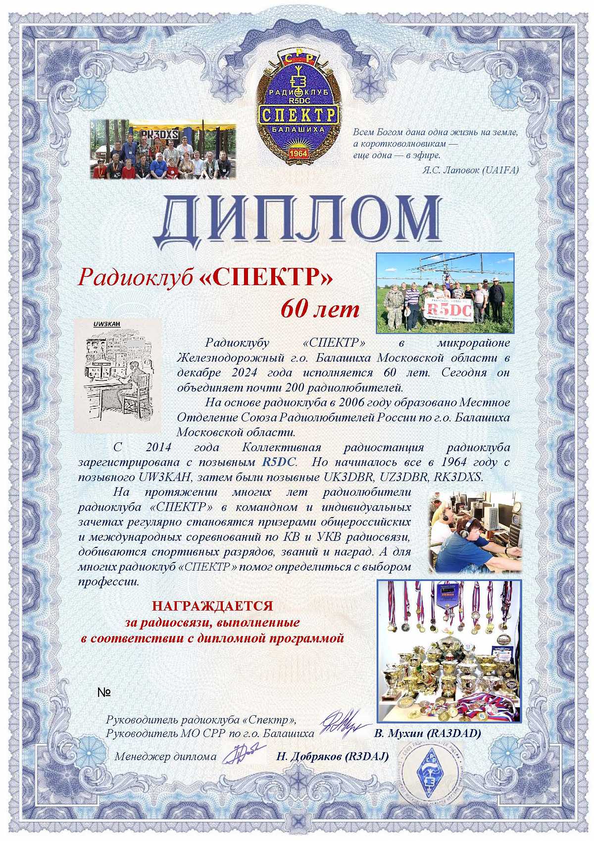 Для получения диплома « Радиоклуб «СПЕКТР » 60 лет» необходимо набрать 60 очков за проведенные QSO с российскими радиостанциями.