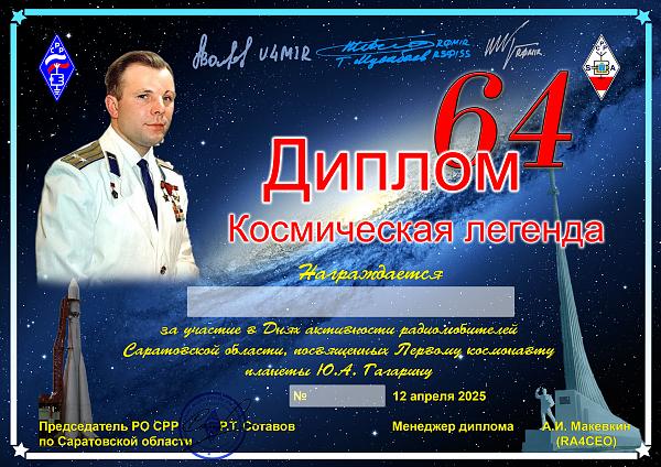 Диплом учреждён Региональным отделением Союза Радиолюбителей России по Cаратовской области в честь Первого космонавта планеты — Юрия Алексеевича Гагарина.