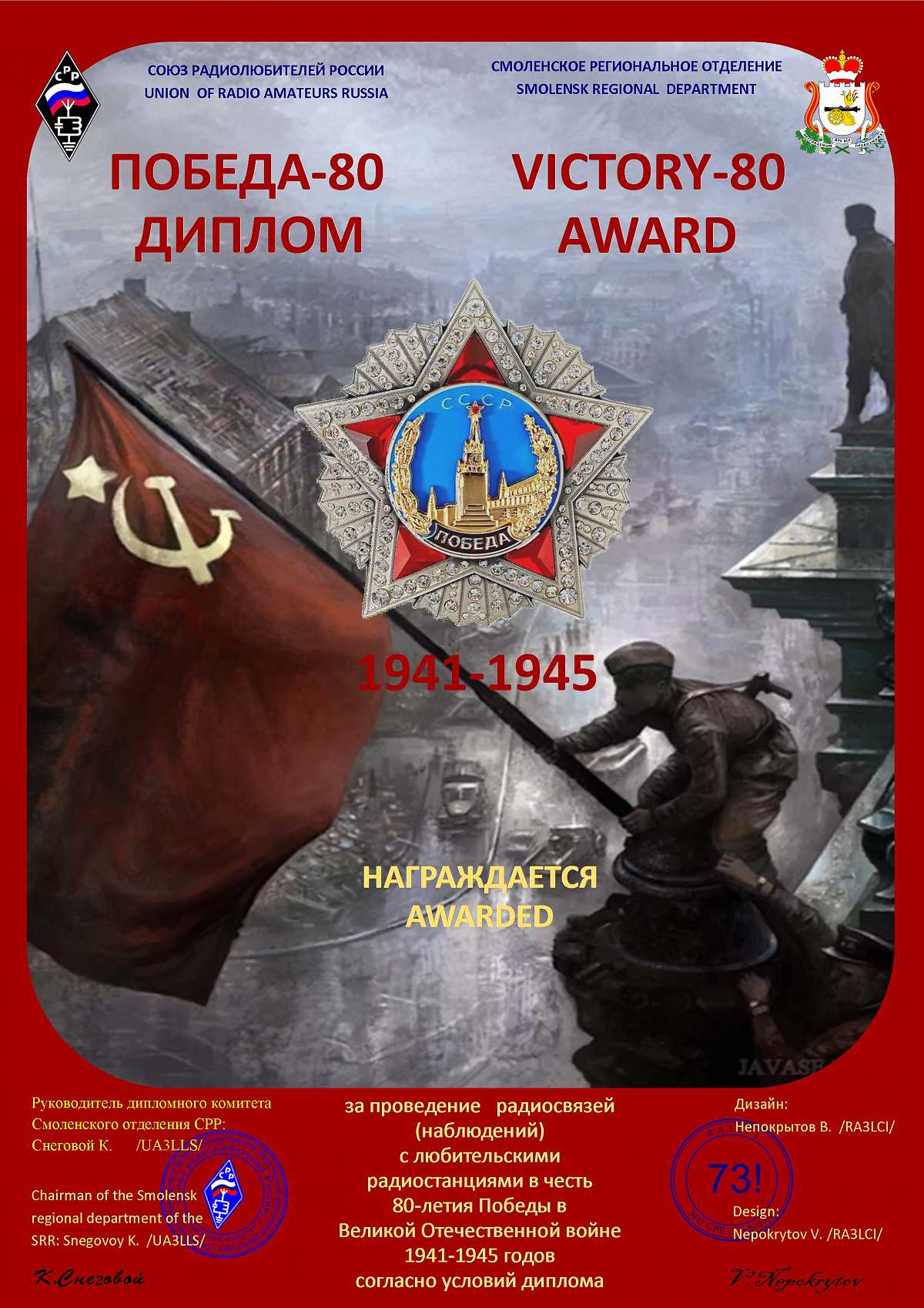 Диплом выдаётся радиолюбителям/наблюдателям России, стран СНГ и стран дальнего зарубежья за проведение QSO/SWL c радиостанциями ряда областей Российской федерации с 01.05.2025 года по 09.05.2025 г. видами излучения CW, PHONE, DIGI на всех любительских КВ диапазонах. Необходимо набрать 80 очков.