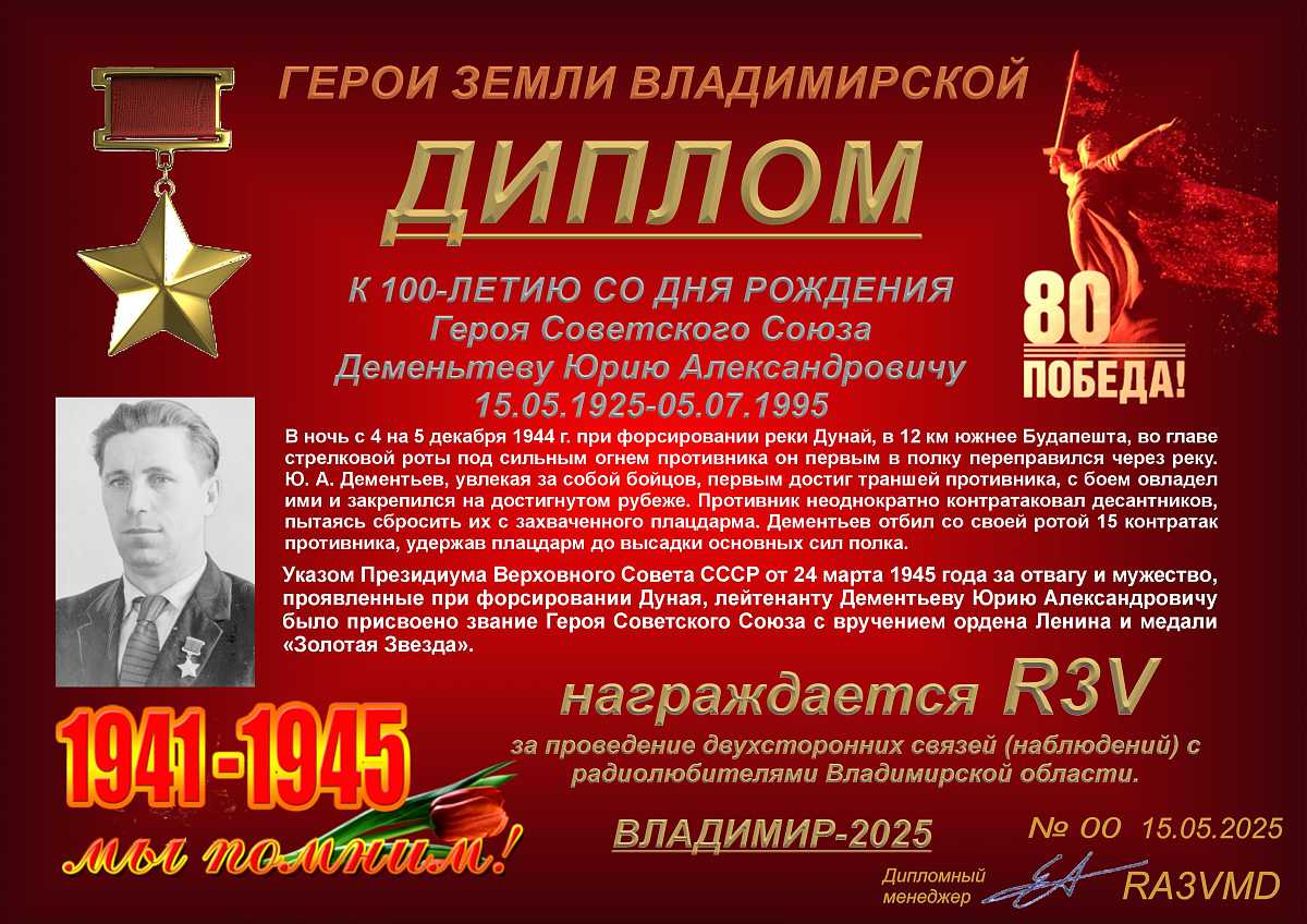областным радиоклубом и посвящен 100-летию со дня рождения Героя Советского Союза Дементьева Юрия Александровича – командира роты 1077-го стрелкового Краснознамённого полка (316-я стрелковая Темрюкская Краснознамённая дивизия, 46-я армия, 2-й Украинский фронт), лейтенанта.