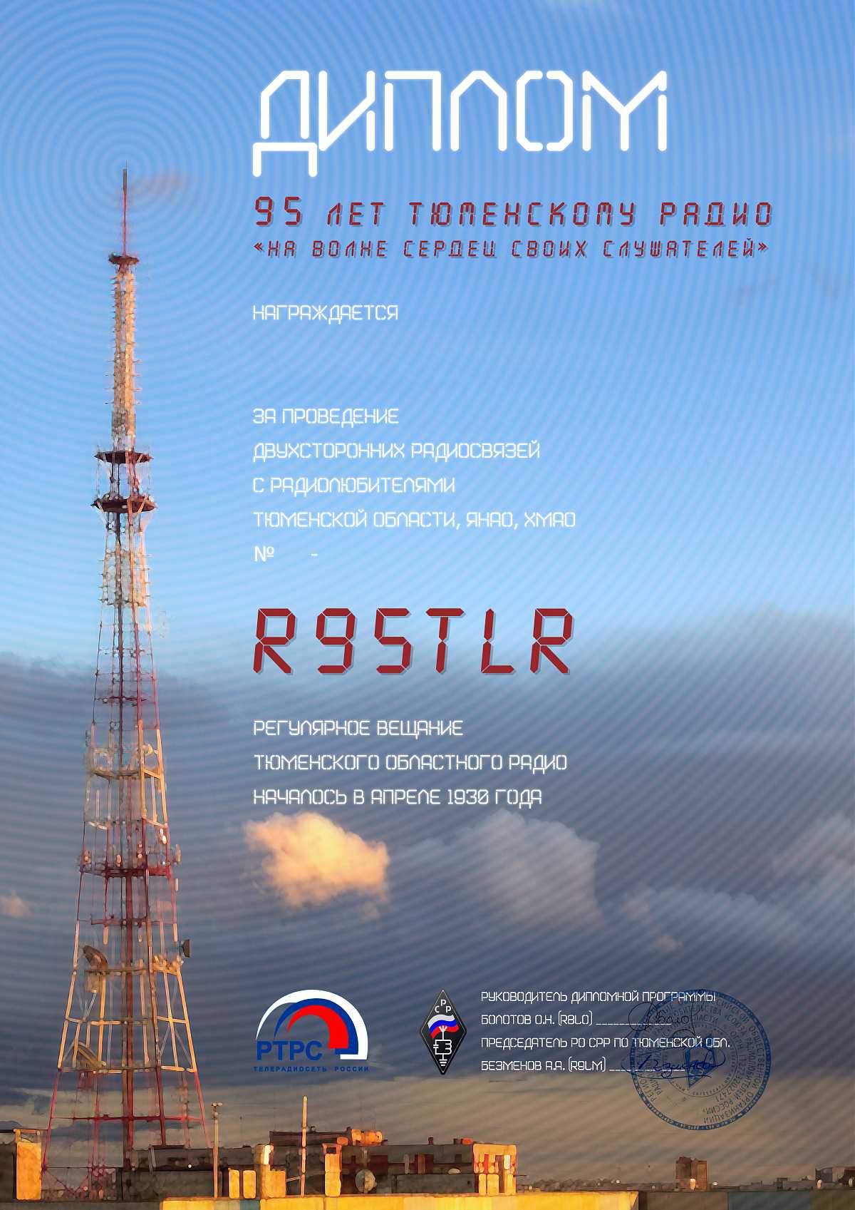 Тюменское региональное отделение СРР в честь 95-летия областного радио г. Тюмени, в целях популяризации любительской радиосвязи, учредило диплом «95 лет Тюменскому областному радио».