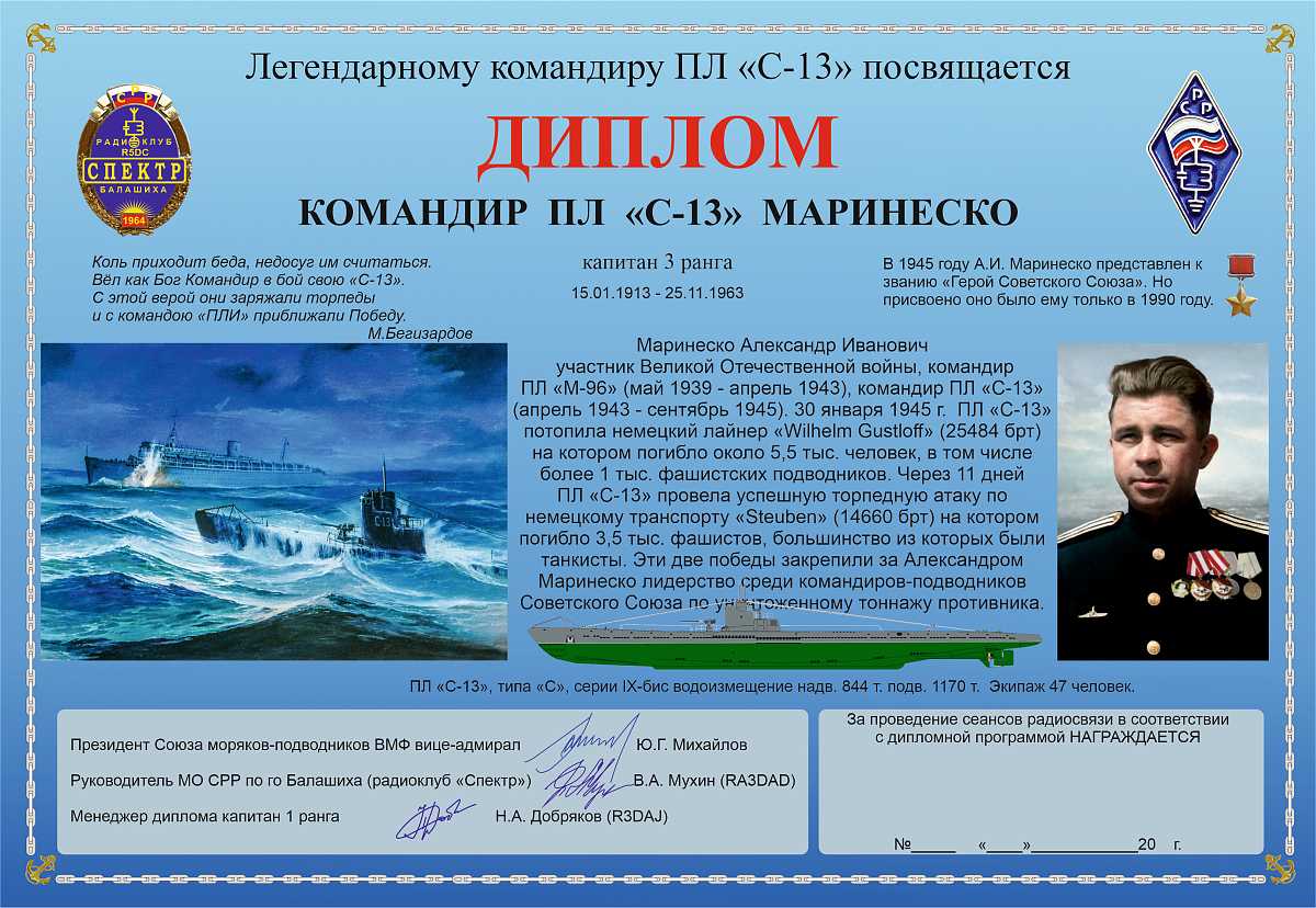 Радиоклуб «Спектр» г.о. Балашиха Московской области при поддержке Московского областного отделения СРР, с участием ветеранов ВМФ подготовили диплом «Командир ПЛ «С-13» МАРИНЕСКО» в честь легендарного командира подводной лодки «С-13».