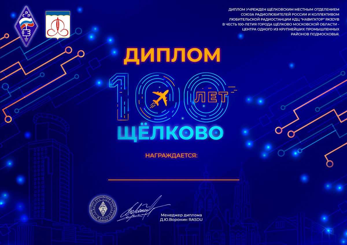 Диплом учрежден Щёлковским местным отделением Союза радиолюбителей России и Коллективом любительской радиостанции КДЦ "Навигатор" RK3DYB в честь 100-летия присвоения пос. Щёлково Московской области статуса города.