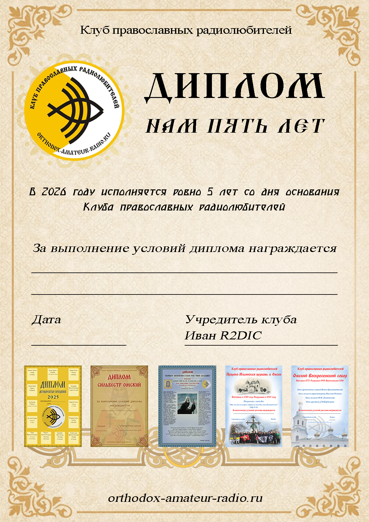 Для получения диплома необходимо провести не менее 5 QSO/SWL с членами клуба. Список на сайте OAR - https://orthodox-amateur-radio.ru/