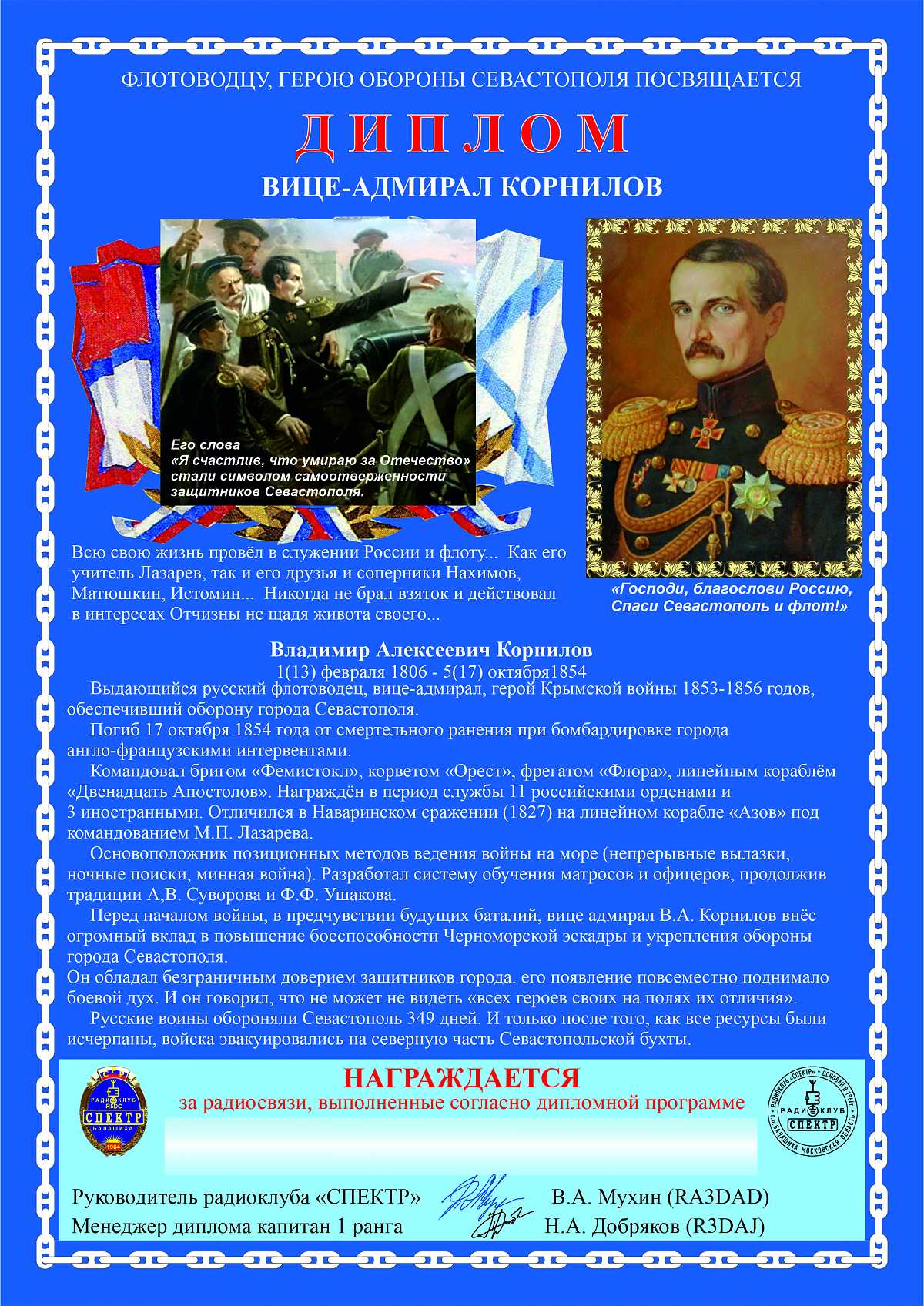 Радиоклуб «Спектр», г.о. Балашиха Московской области, с участием ветеранов ВМФ, подготовили диплом «ВИЦЕ-АДМИРАЛ КОРНИЛОВ».
